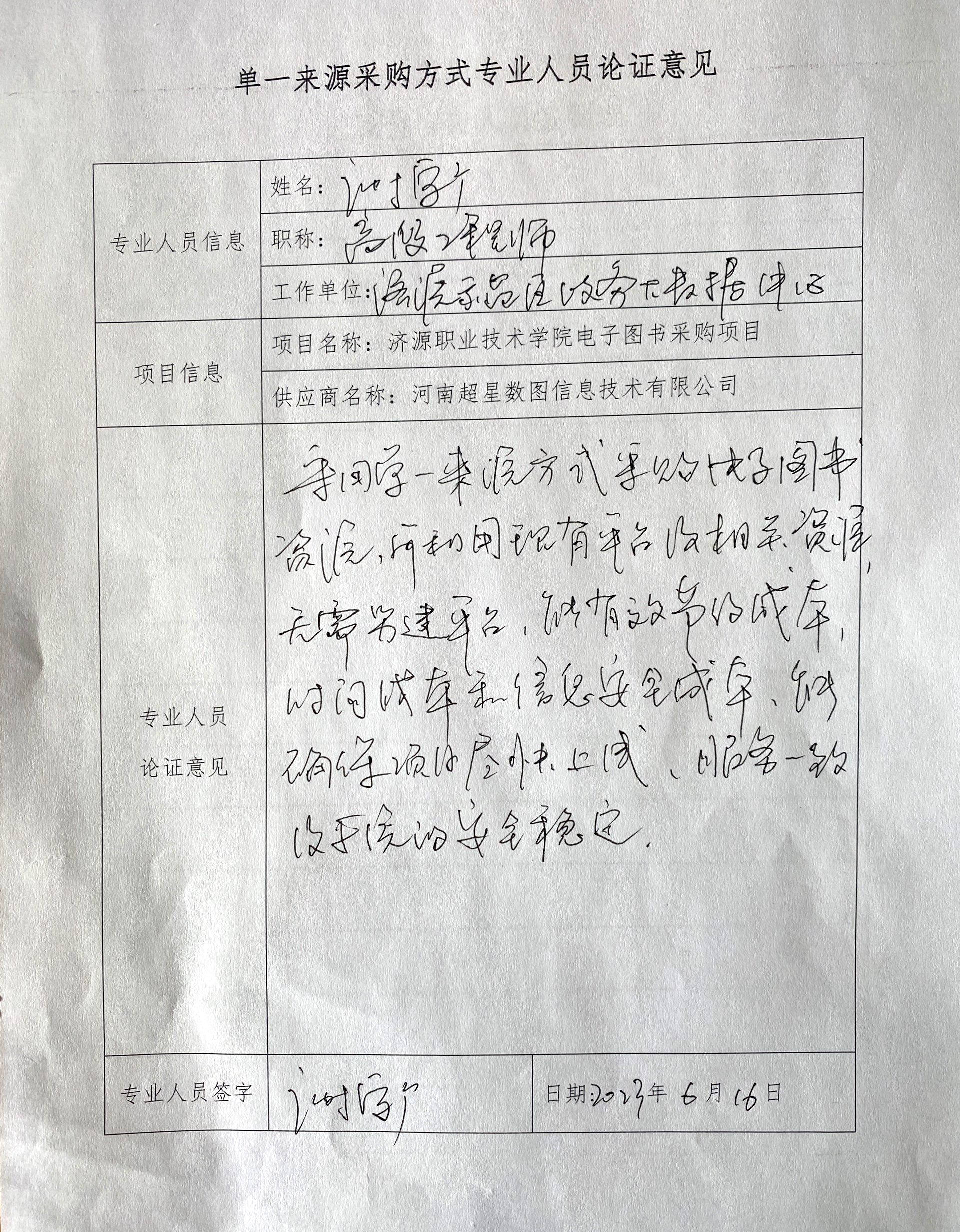 一、项目信息: 1.项目名称:济源职业技术学院电子图书采购项目 2.拟采购的货物或服务的说明 电子图书采购; 3.拟采购的货物或服务的预算金额:100000元 4.单一来源原因及相关说明 学院从2006年开始订购使用超星电子图书数据库,之后根据学院年度预算,每年都增购一定数量的电子图书(学校教学评估有指标要求),在保持数据统一、连续、便于维护的同时,极大丰富了图书馆馆藏。多年来,读者使用反馈情况良好,可以保证文献资源更新的连续性、兼容性。为我校师生教学科研工作、学习提供丰富、权威、全面的文献资源,满足我校的专业建设和用户需求。通过前期对超星电子图书数据库的调查、试用、分析和综合评估,读者反馈意见良好。此次采购,是在原有平台的基础上延续并扩充电子图书资源。 学院采购超星数字图书数据库是由北京世纪超星信息技术发展有限责任公司独家开发的产品,河南超星数图信息技术有限公司是河南地区的唯一授权销售方,具有产品来源唯一性。综上,根据《中华人民共和国采购法》第三十一条规定,适用采取单一来源方式采购。 二、拟定供应商信息: 1.名称:河南超星数图信息技术有限公司 2.地址:河南自贸试验区郑州片区(郑东)金水东路85号雅宝东方国际广场1号楼9楼903号 三、专家论证意见(不少于三名行业技术专家)