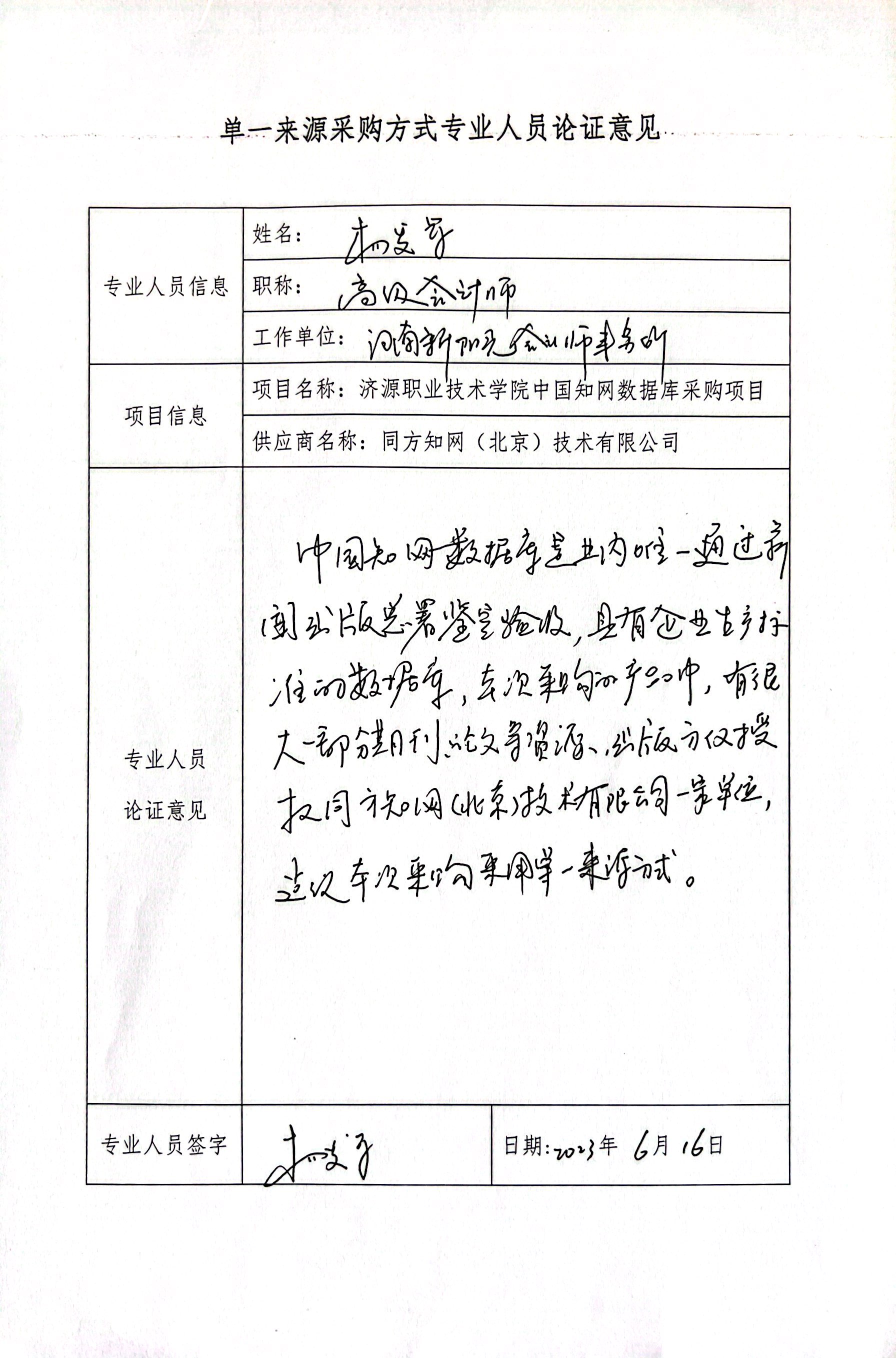 一、项目信息: 1.项目名称:济源职业技术学院中国知网数据库采购项目 2.拟采购的货物或服务的说明 中国知网数据库采购; 3.拟采购的货物或服务的预算金额:150000元 4.单一来源原因及相关说明 (1)正规版权:中国知网数据库是业内唯一通过新闻出版总署鉴定验收,唯一具有企业生产标准的数据库。中国标准刊号: CN 11-9101/N ,国际统一刊号:ISSN1007-8010。 (2)优先出版:中国知网数据库数据资源更新及时、快捷,国内唯一实现了部分电子期刊优先纸质期刊1-3个月出版。 (3)我校长期使用中国知网的数据库服务,使用效果良好,为了更好的建设馆藏资源,保持资源使用的连续性和一致性,继续采购中国知网数据库很有必要。 (4)本次采购的产品中,有很大一部分期刊、博硕论文等资源,出版方仅把网络出版授权给了同方知网(北京)技术有限公司一家单位,只能从该厂家获得。 因此,本次采购的数字资源中,存在只能从唯一生产商获取的情况。 二、拟定供应商信息: 1.名称:同方知网(北京)技术有限公司 2.地址:北京市海淀区西小口路66号东升科技园北领地A区第2号楼 三、专家论证意见(不少于三名行业技术专家)
