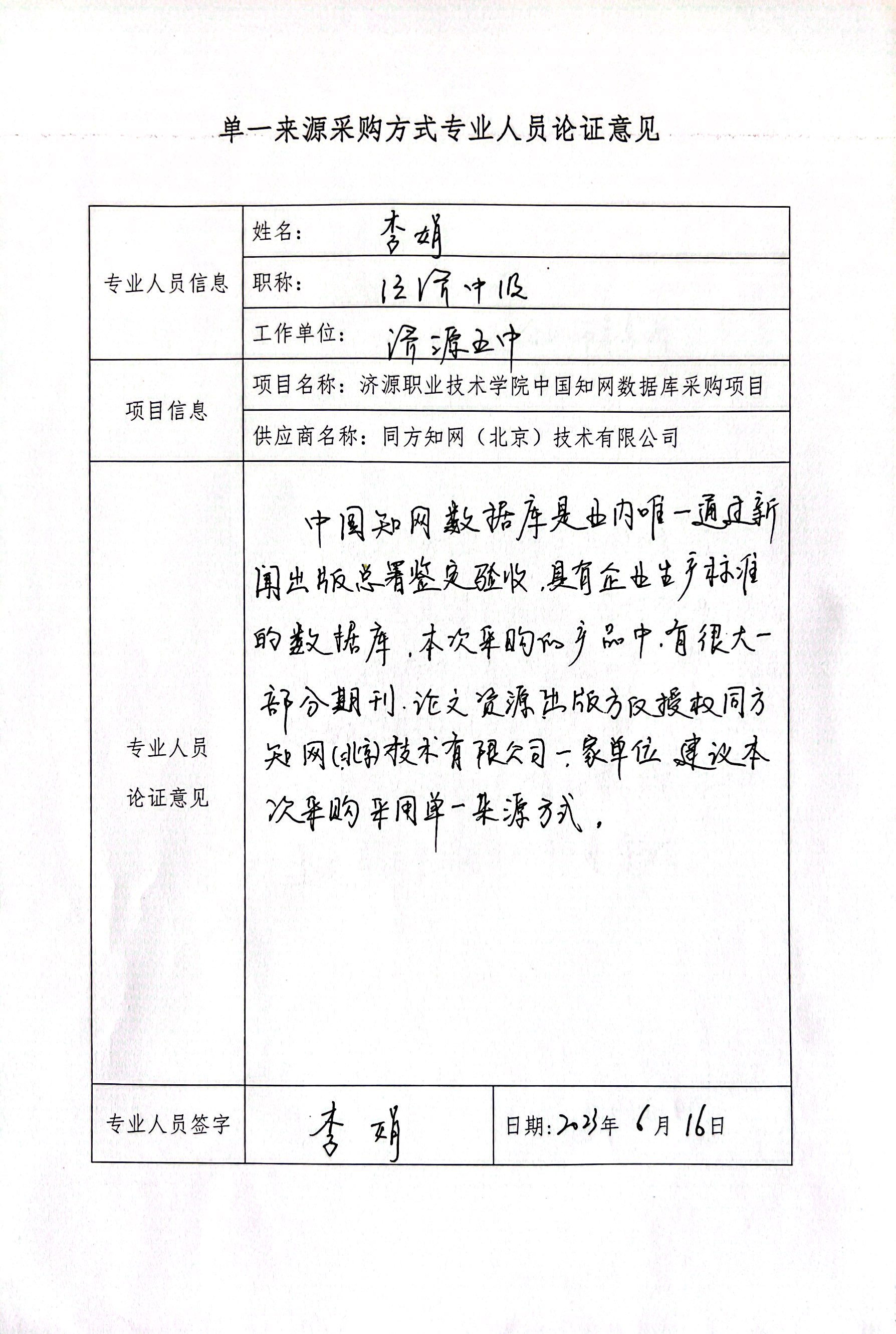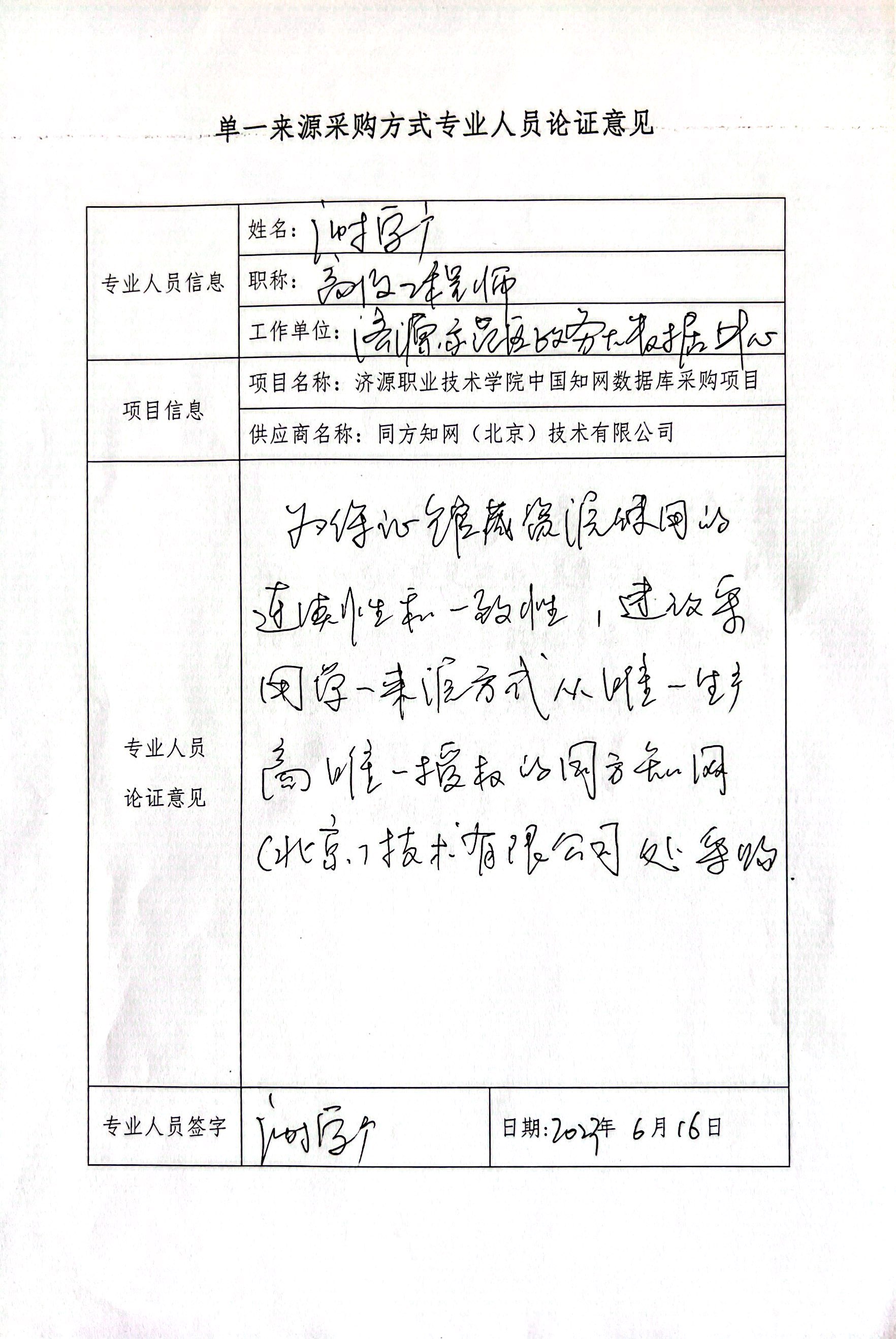 一、项目信息: 1.项目名称:济源职业技术学院中国知网数据库采购项目 2.拟采购的货物或服务的说明 中国知网数据库采购; 3.拟采购的货物或服务的预算金额:150000元 4.单一来源原因及相关说明 (1)正规版权:中国知网数据库是业内唯一通过新闻出版总署鉴定验收,唯一具有企业生产标准的数据库。中国标准刊号: CN 11-9101/N ,国际统一刊号:ISSN1007-8010。 (2)优先出版:中国知网数据库数据资源更新及时、快捷,国内唯一实现了部分电子期刊优先纸质期刊1-3个月出版。 (3)我校长期使用中国知网的数据库服务,使用效果良好,为了更好的建设馆藏资源,保持资源使用的连续性和一致性,继续采购中国知网数据库很有必要。 (4)本次采购的产品中,有很大一部分期刊、博硕论文等资源,出版方仅把网络出版授权给了同方知网(北京)技术有限公司一家单位,只能从该厂家获得。 因此,本次采购的数字资源中,存在只能从唯一生产商获取的情况。 二、拟定供应商信息: 1.名称:同方知网(北京)技术有限公司 2.地址:北京市海淀区西小口路66号东升科技园北领地A区第2号楼 三、专家论证意见(不少于三名行业技术专家)